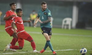 First-half goals from Mathew Leckie and Fran Karacic had Graham Arnold’s side sitting comfortably in Kuwait, with Nepal’s Rohit Chand sent off just before half-time. Martin Boyle’s close-range finish close to the hour mark sealed a 3-0 win.